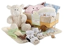 Our favorite farmhouse friends fit perfectlyon baby and in this charming, burlap-lined, 9 ½ l x 5 ¾ w x 4 ½ wooden wagon that becomes delightful nursery decor! Theres a lovable, gently textured lambie on the baaa-dysuit, and thats just the beginning! This 100%-cotton layette has more to love! An embroidered piggy bib, horse hat and cow booties are waiting on the wagon for baby, along with a plush lamb, a cute corn rattle and a designer lovie quiltfabulous and fresh from the farmthat matches the layette colors of beige, brown and soft pink, yellow and blue. Every mom and dad will be deeply mooooved by this wagonful of wow that comes beautifully presented in an organza bag with a printed ribbon.
