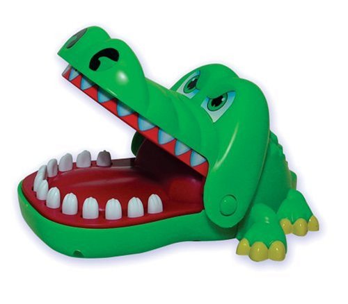 Poor old croc has a tooth that's bothering him; pretend to be a dentist to help him out. Press the wrong tooth and he'll surprise you. With no loose parts and exciting snapping jaws, this is one game that will thrill toddlers and primary schoolers alike. No batteries required.My twins (3 1/2 yrs old) are terrified of this, but we grown-ups find it awesome. Our one yr old likes it so much he plays alone (not smart- I don't think he gets the purpose!). Great game for teaching turn-taking, since nobody really wants a turn anyway. The big kids will play it using a toothbrush to avoid finger snapping (which doesn't hurt- just surprising). Fun fun fun!